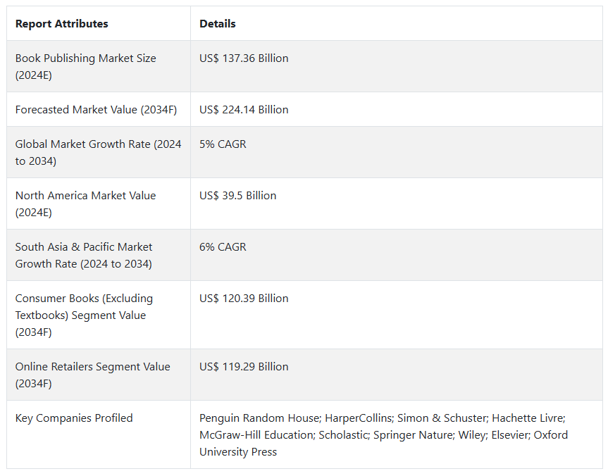 Fact.MR은 이 새로운 시장 보고서에서 전 세계에 위치한 도서 출판 시장의 주요 업체들의 가격대, 매출 성장, 생산 능력, 투기적 기술 확장에 대한 자세한 정보를 제공합니다.