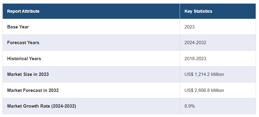 글로벌 유방 병변 국소화 방법 시장 규모는 2023 년에 미화 1,214.2 만 달러에 달했습니다. 앞으로 IMARC 그룹은 2024-2032년 동안 8.9%의 성장률(CAGR)을 보이며 2032년까지 시장이 미화 2,656.8백만 달러에 이를 것으로 예상하고 있습니다.