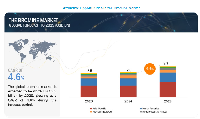 브롬 시장은 2024년 26억 달러에서 2029년 33억 달러로 2024년부터 2029년까지 4.6%의 연평균 성장률(CAGR)로 성장할 것으로 예상됩니다. 지속적인 연구 개발 노력으로 특성과 용도가 향상된 혁신적인 브롬 기반 제품이 개발되고 있습니다. 브롬 추출 기술, 합성 방법 및 제형 기술의 발전으로 산업 전반에 걸쳐 브롬의 시장 기회가 확대되고 있습니다. 이러한 기술 발전은 브롬 시장의 전반적인 성장에 기여하고 있습니다.