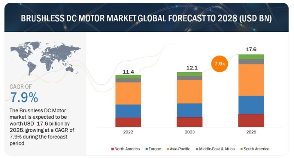 전 세계 브러시리스 DC 모터 시장은 2023년 121억 달러에서 2028년에는 176억 달러에 달할 것으로 예상되며, 예측 기간 동안 7.9%의 연평균 성장률(CAGR)을 기록할 것으로 전망됩니다. 브러시리스 DC 모터 시장은 높은 에너지 효율, 낮은 유지보수 필요성, 정밀한 제어로 인한 수요 증가로 인해 확대되고 있습니다. 로봇 공학, 전기 자동차 및 제조 산업 전반에서 성능과 신뢰성을 향상시키기 위해 이러한 모터를 채택하여 전체 시장 성장에 기여하고 있습니다.