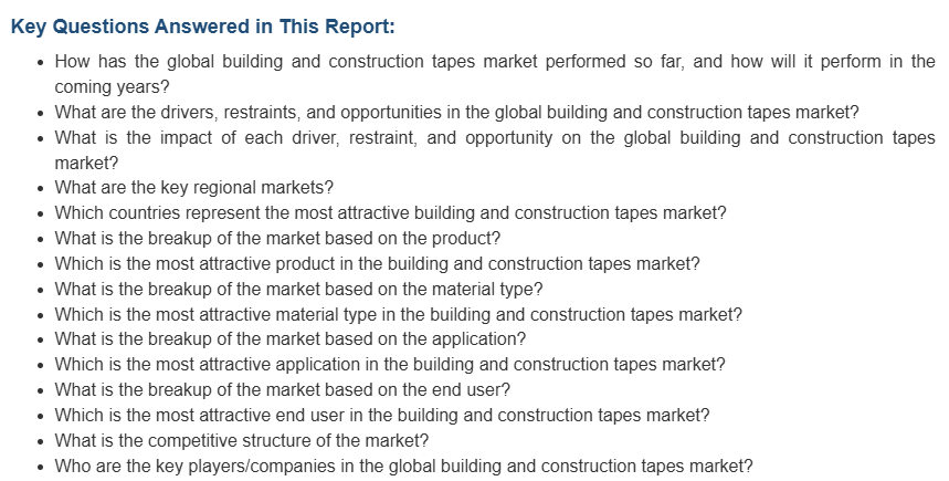 이 시장 조사 보고서는 또한 시장의 경쟁 구도에 대한 포괄적인 분석을 제공합니다. 모든 주요 기업의 상세한 프로필도 제공됩니다. 건축 및 건설용 테이프 산업의 주요 시장 참여자 중 일부는 3M Company, Avery Dennison Corporation, Berry Global Inc, Bostik SA (Arkema), DuPont de Nemours Inc., Henkel AG & Co. KGaA, Nitto Denko Corporation, Saint-Gobain Corporation, Scapa Group Plc., Shurtape Technologies LLC, Tesa SE 등이 있습니다.