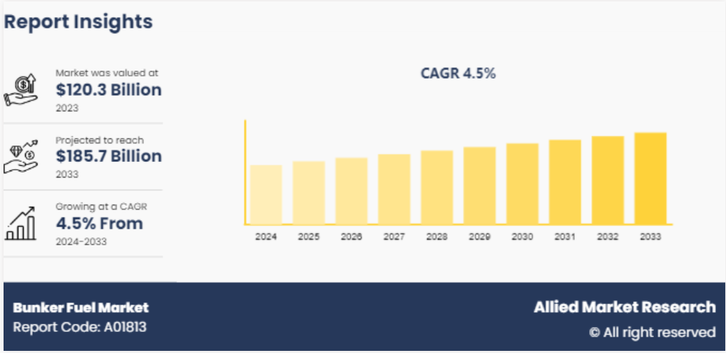 전 세계 벙커유 시장은 2023년 1,203억 달러 규모였으며, 2024년부터 2033년까지 연평균 4.5% 성장하여 2033년에는 1,857억 달러에 달할 것으로 예상됩니다.