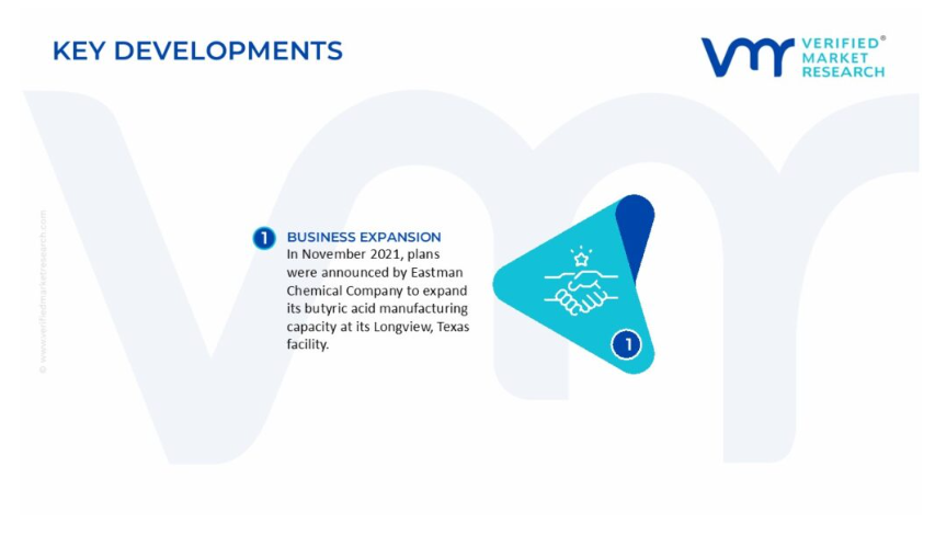 2021년 11월, 이스트만 케미컬 컴퍼니는 텍사스 롱뷰 시설의 부티르산 제조 능력을 확대할 계획을 발표했습니다. 이 확장은 식음료, 제약, 동물 사료 등 다양한 산업 분야에서 증가하는 부티르산 수요를 충족하기 위한 것입니다.