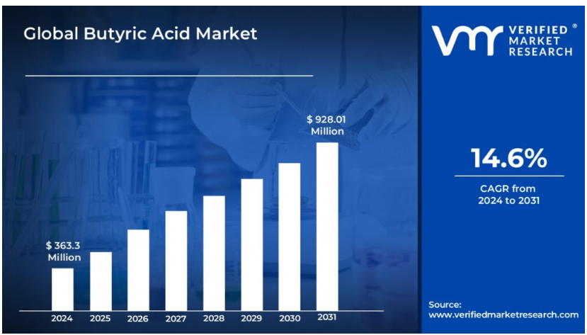 또한, 부티르산은 다양한 식품의 맛을 내고 보존하는 데 사용됩니다. 부티르산이 포함된 글로벌 식품 향료 시장은 급속하게 성장하고 있습니다. Verified Market Research에 따르면, 글로벌 식품 향료 시장은 2023년에 258억 9천만 달러의 가치를 지니고 있으며, 2024년부터 2031년까지 11.35%의 연평균 성장률(CAGR)로 증가할 것으로 예상됩니다. 이는 새로운 이국적인 향에 대한 소비자의 욕구가 증가하고 있기 때문입니다.