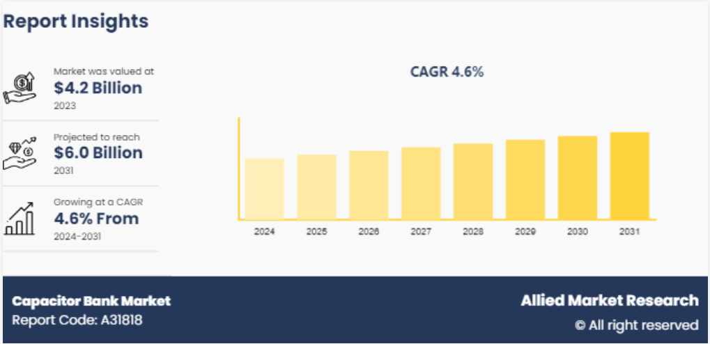 글로벌 커패시터 뱅크 시장은 2023년에 42억 달러 규모로 평가되었으며, 2031년까지 60억 달러에 이를 것으로 예상되며, 2024년부터 2031년까지 연평균 성장률 4.6%로 성장할 것으로 전망됩니다.