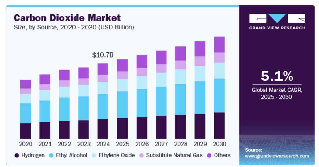 전 세계 이산화탄소 시장 규모는 2024년 10,718.18백만 달러로 추정되었으며 2025년부터 2030년까지 5.1%의 연평균 성장률(CAGR)로 성장할 것으로 예상됩니다. 이산화탄소(CO2)의 석유 회수 향상(EOR)에 대한 적용이 증가하는 것은 주로 석유 매장량이 고갈되고 특히 아시아에서 원유 수입에 대한 의존도가 높기 때문입니다. 또한 식음료 및 의료 부문과 같은 최종 사용 산업이 성장함에 따라 예측 기간 동안 CO2 시장이 증가할 것으로 예상됩니다. 세계 최고의 CO2 시장 중 하나인 미국의 경우 향후 몇 년간 연평균 4.8%의 성장률을 보일 것으로 예상됩니다. 이러한 성장은 산업화의 증가와 미국의 석유 및 가스 산업 확대에 기인합니다.