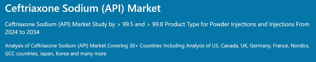 세계의 세프트리악손 나트륨(API) 시장 : 제품 유형별 ( > 99.5, > 99.8) 한국, 아시아, 미국 2024년-2034년, 시장 전망