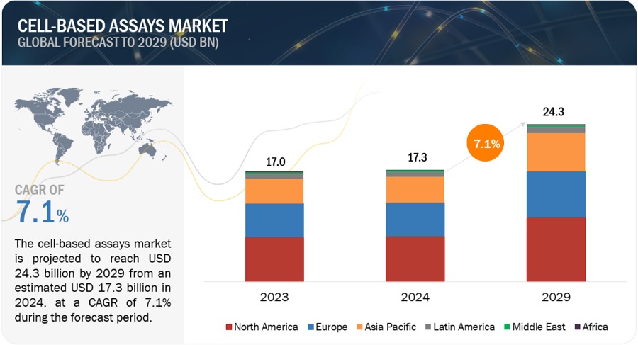 세포 기반 분석 시장은 2024년 173억 달러에서 2029년에는 243억 달러에 달할 것으로 예상되며, 2024년부터 2029년까지 예측 기간 동안 7.1%의 CAGR로 성장할 것으로 전망됩니다. 세포 기반 분석 시장의 성장은 신약 발견 및 개발에 대한 수요 증가와 신약 발견에서 세포 기반 분석에 대한 선호도 증가, 세포 기반 연구에 대한 정부 지원 및 자금 지원, 동물 기반 연구를 축소하려는 FDA의 노력 증가와 같은 요인에 기인할 수 있습니다. 암 유병률의 증가도 세포 기반 분석 시장의 성장을 주도하고 있습니다. 신약 개발의 혁신을 가속화하기 위한 전략적 제휴의 채택이 증가함에 따라 세포 기반 분석 시장의 성장도 촉진될 것으로 예상됩니다. 또한 만성 질환 및 개인 맞춤형 의학에서 세포 기반 분석의 응용 분야가 증가함에 따라 향후 몇 년 동안 시장의 성장을 지원할 것으로 보입니다. 그러나 높은 기기 비용과 시약에 대한 제품 최종 사용자 라이선스로 인한 제한은 시장 성장을 저해 할 수 있습니다.