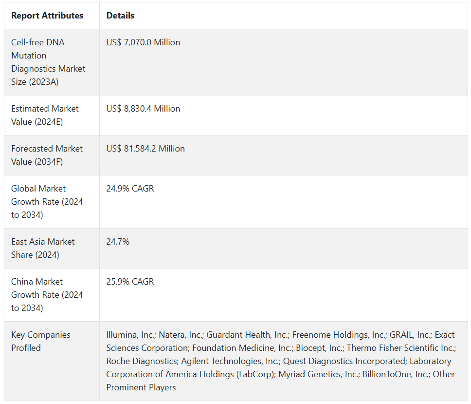 Fact.MR은 최근 발표된 보고서에서 지역별 주요 무세포 DNA 돌연변이 진단 제조업체의 가격대, 매출 성장, 생산 능력, 투기적 기술 확장에 대한 자세한 정보를 제공했습니다.