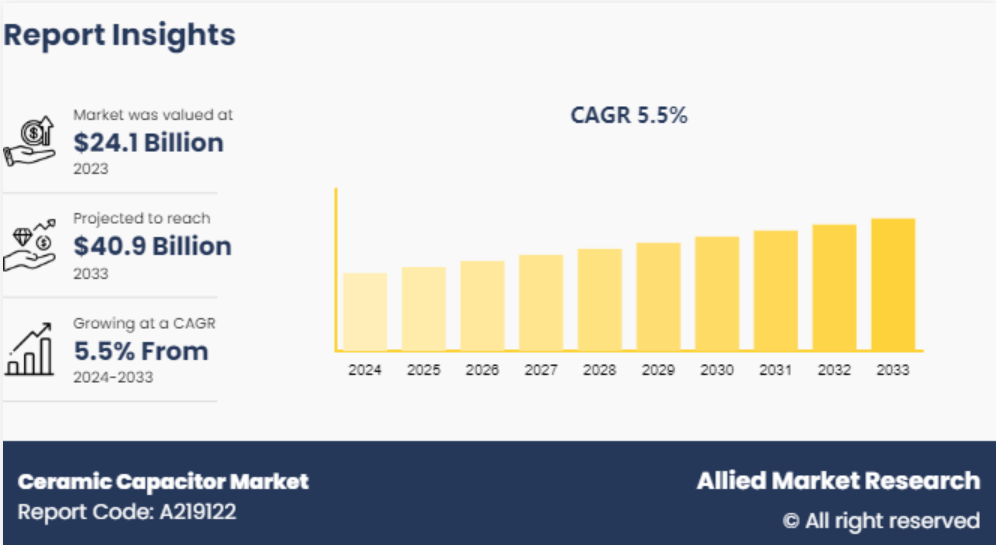 2023년 기준, 전 세계 세라믹 커패시터 시장 규모는 241억 달러로 추정되며, 2033년에는 409억 달러에 이를 것으로 예상됩니다. 2024년부터 2033년까지 연평균 성장률(CAGR)이 5.5%에 달할 것으로 전망됩니다.