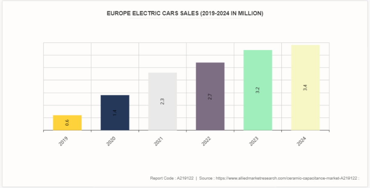 또한, 신재생 에너지 시스템, 전기 자동차(EV), 5G 인프라와 같은 새로운 응용 분야에서 세라믹 커패시터의 채택이 증가함에 따라 세라믹 커패시터 시장 전망에 상당한 성장 기회가 나타날 것으로 예상됩니다. 재생 에너지 시스템에서 세라믹 커패시터는 에너지 저장 및 변환 응용 분야에서 매우 중요합니다. 인버터, 충전 컨트롤러, 에너지 저장 시스템에서 전기 에너지를 효율적으로 관리하고 조절하는 데 사용됩니다. 환경 문제와 에너지 독립 목표에 힘입어 재생 에너지 원으로의 전환이 가속화됨에 따라, 높은 전압과 온도를 견딜 수 있는 세라믹 커패시터에 대한 수요가 계속 증가하고 있습니다. 전기 자동차(EV)는 세라믹 커패시터의 또 다른 급성장 시장입니다. 이 차량들은 추진, 배터리 관리, 온보드 충전 등을 위해 복잡한 전자 시스템에 의존하고 있으며, 이 모든 시스템에는 높은 전력 밀도를 처리하고 자동차 환경에서 안정적으로 작동할 수 있는 커패시터가 필요합니다. 정부의 인센티브와 기술 발전에 힘입어 전기 이동성에 대한 추세가 증가하면서, EV 전력 전자 장치와 에너지 저장 시스템에 세라믹 커패시터의 통합이 증가하고 있습니다. 국제에너지기구(IEA)에 따르면, 2023년 전 세계적으로 약 1,400만 대의 신형 전기 자동차가 등록되어 도로 위 차량 총 수가 4,000만 대에 달할 것으로 예상되며, 이는 2023년 판매량 전망치를 근접하게 추정한 수치입니다. 2023년 전기 자동차 판매량은 2022년보다 350만 대가 더 많은 35%의 전년 대비 증가율을 기록했습니다.