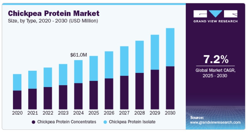 전 세계 병아리콩 단백질 시장 규모는 2024년 6,102만 달러로 추정되며 2025년부터 2030년까지 7.2%의 연평균 성장률(CAGR)로 성장할 것으로 예상됩니다. 주요 동인 중 하나는 더 많은 소비자가 채식 및 비건 식단으로 전환함에 따라 식물성 단백질에 대한 수요가 증가하고 있다는 점입니다. 이러한 추세는 특히 건강에 대한 의식이 높아지고 있는 북미와 유럽과 같은 지역에서 두드러지게 나타나고 있으며, 육류 제품에 대한 영양가 있는 대안으로 병아리콩의 소비가 증가하고 있습니다.