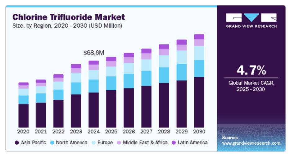 글로벌 삼불화염소 시장 규모는 2024년에 미화 6,860만 달러로 추정되었으며, 2025년부터 2030년까지 연평균 4.7% 성장할 것으로 예상됩니다. 화학 산업의 성장은 삼불화염소(ClF3) 시장의 중요한 동력이 되고 있습니다. 특히 특수 화학 제품과 의약품에 대한 전 세계 수요가 계속 증가함에 따라 더욱 그렇습니다. 삼불화염소의 독특한 특성으로 인해 수많은 화학 합성 공정에 필수적인 구성 요소로 자리 잡으면서 이 분야의 확장에 기여하고 있습니다. 제조업체들이 혁신적인 화학 솔루션을 모색함에 따라, 특히 정부의 지원 정책이 있는 신흥 시장에서 ClF3에 대한 수요가 증가할 것으로 예상됩니다.