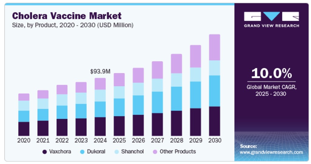 전 세계 콜레라 백신 시장 규모는 2024년에 9,390만 달러로 평가되었으며 2025년부터 2030년까지 10.0%의 연평균 성장률을 보일 것으로 예상됩니다. 이 시장은 풍토병 지역에서 콜레라 발생에 대한 인식이 높아짐에 따라 성장할 것으로 예상됩니다. 다양한 백신 접종 옵션과 경구 및 주사제 제형이 특징입니다. 국제 보건 기구와 정부 이니셔티브의 노력으로 콜레라 발생을 줄이기 위한 백신 접종 캠페인이 강화되었습니다. 또한 지속적인 연구와 기술 발전으로 백신 프로그램의 효능과 접근성이 향상될 것으로 기대됩니다.