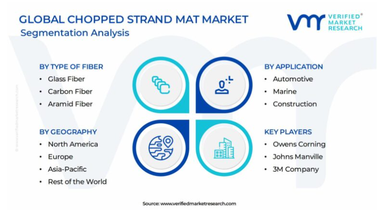 찹 스트랜드 매트 시장은 섬유 유형, 응용 분야, 수지 유형 및 지역에 따라 세분화됩니다. 섬유 유형별로는 유리 섬유, 탄소 섬유, 아라미드 섬유 등으로 나뉘며, 유리 섬유가 시장에서 가장 큰 비중을 차지하고 있습니다. 응용 분야별로는 자동차, 해양, 건설 및 전기 전자 분야가 있으며, 각각의 분야에서 찹 스트랜드 매트의 수요가 증가하고 있습니다.
