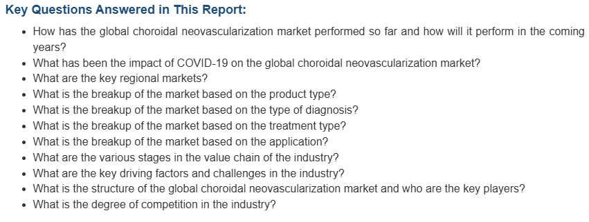 연령 관련 황반변성(ARMD), 안구 히스토플라스마증, 병적 근시, 혈관성 줄무늬, 맥락막 파열, 맥락막 및 망막의 염증성 질환의 증가로 인해 시장이 성장하고 있습니다. 또한, 심각한 건강 상태에 더 취약한 고령 인구의 증가는 시장 성장을 촉진하는 또 다른 핵심 요인으로 작용하고 있습니다. 또한, 오래 지속되는 항-VEGF 약물의 도입과 함께 복합 약물의 사용이 증가하면서 전 세계적으로 CNV 치료에 대한 수요가 증가하고 있습니다. 의료 인프라 개선 및 연구 개발(R&D) 활동에 대한 투자 증가와 같은 다른 요인들도 시장 성장에 기여하고 있습니다.