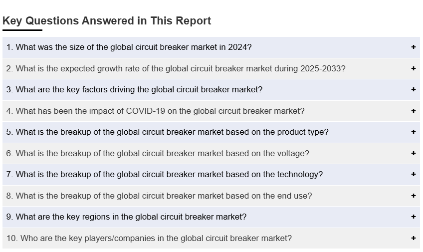 글로벌 차단기 시장 규모는 2024년에 92억 달러에 달했습니다. IMARC 그룹은 2033년까지 시장 규모가 121억 달러에 달할 것으로 예상하고 있으며, 2025-2033년 동안 연평균 성장률(CAGR)이 2.8%에 달할 것으로 전망하고 있습니다. 재생 가능 에너지에 대한 수요 증가, 공공 시설 및 발전소에 차단기 설치 증가, 가정에서 전기 기기의 급속한 사용 등이 시장 성장을 견인하는 주요 요인입니다.