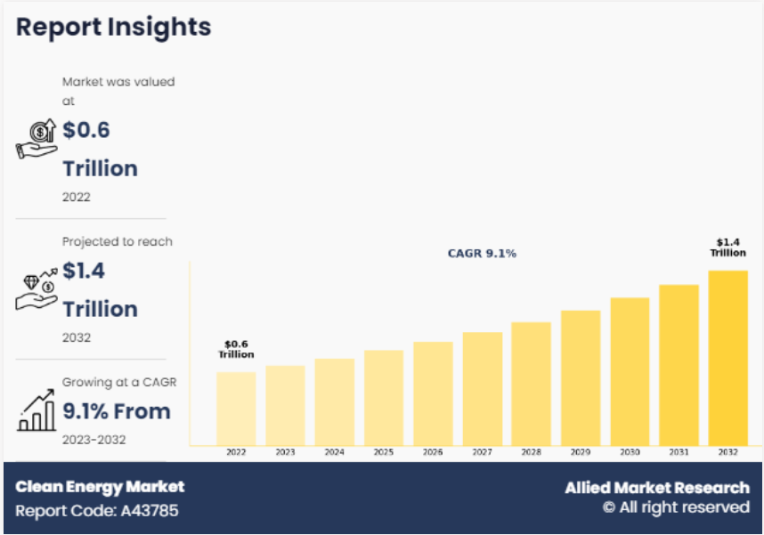 2022년 세계 청정 에너지 시장의 가치는 6천억 달러였으며, 2032년에는 1조 4천억 달러에 이를 것으로 예상되며, 2023년부터 2032년까지 연평균 성장률 9.1%로 성장할 것으로 전망됩니다. 청정 에너지 시장은 재생 에너지의 기술적 발전, 정부 정책 및 규제, 에너지 안보에 대한 우려 등 여러 요인으로 인해 성장하고 있습니다. 그러나 높은 초기 비용, 간헐적 및 저장 문제, 화석 연료와의 경쟁으로 인해 시장 성장이 제한되고 있습니다. 또한, 에너지 저장 솔루션과 친환경 에너지 건물에 대한 투자는 친환경 에너지 시장 확장을 위한 매력적인 기회를 창출합니다.