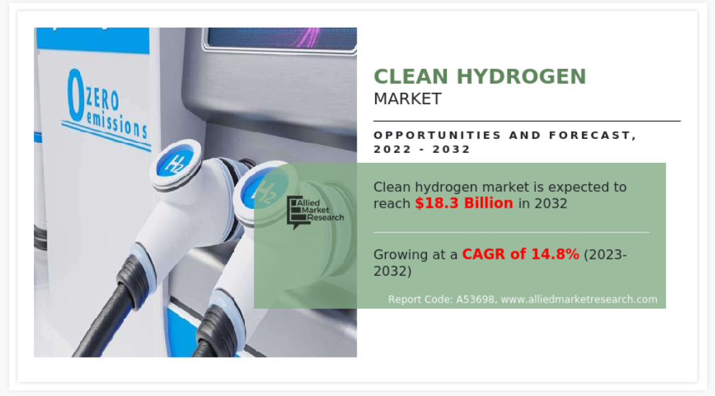 2022년 전 세계 청정 수소 시장의 가치는 38억 달러였으며, 2032년에는 183억 달러에 이를 것으로 예상되며, 2023년부터 2032년까지 연평균 14.8%의 성장률을 보일 것으로 전망됩니다.