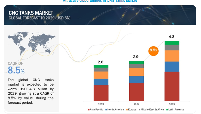 글로벌 CNG 탱크 시장은 2024년 29억 달러 규모이며 2024년부터 2029년까지 연평균 8.5% 성장하여 2029년에는 43억 달러에 달할 것으로 예상됩니다. 예측에 따르면 이 시장은 2024년 현재 29억 달러의 가치에서 2029년에는 43억 달러로 성장할 것으로 예상됩니다. CNG 탱크는 저렴하고 환경 친화적인 압축 천연가스 사용으로 차량이 뚜렷하게 전환됨에 따라 수요가 증가하고 있습니다. 지구 환경에 대한 우려 증가, 탱크 구조의 개선, 운송 및 산업용 연료에 대한 비용 효율적인 수요 등이 시장을 견인하고 있습니다. 각국 정부는 유해 오염 물질 배출 제한 및 환경적으로 지속 가능한 연료 소비 개선과 관련된 조치를 포함하는 전략을 채택하고 있습니다. 따라서 CNG 탱크는 높은 수요를 가지고 있으며, 이는 시장의 성장과 창의적인 진화로 이어지고 있습니다.