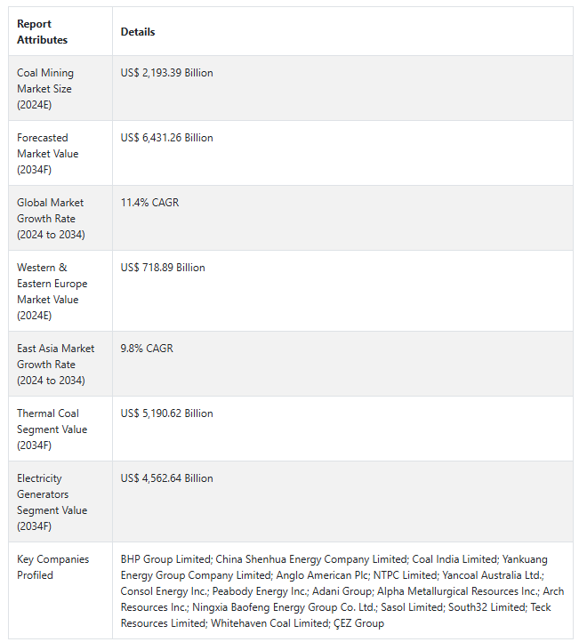 석탄 채굴에 대한 수요는 2024년부터 2034년까지 연평균 11.4%의 성장률로 증가할 것으로 분석됩니다.