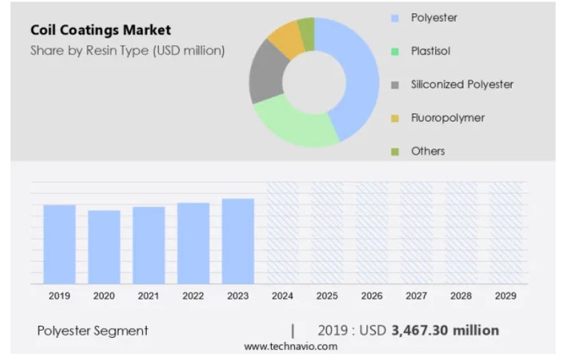 글로벌 코일 코팅제 시장 : 수지 유형 (폴리에스터, 플라스티졸, 실리콘화, 폴리에스터, 불소 중합체, 기타), 한국, 아시아, 미국, 2025-2029, 시장 규모