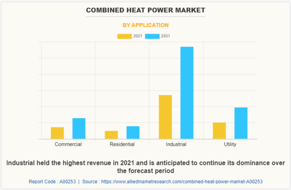 용도별로 2021년 세계 열병합 발전 시장 점유율은 산업용 사이클 부문이 가장 높았습니다. 석유화학 및 제약 산업과 같은 여러 분야에서 열병합 발전 시스템의 사용이 증가함에 따라 시장 성장이 촉진될 것으로 예상됩니다. 또한, 태양광 발전 단위에 열병합 발전 설치를 늘리라는 지침의 장려와 산업화의 혜택을 받는 주거 및 상업 부문의 성장이 산업 부문에 도움이 되고 있습니다. 전력 수요가 증가함에 따라 열병합 발전 장치는 주로 산업에서 사용됩니다.