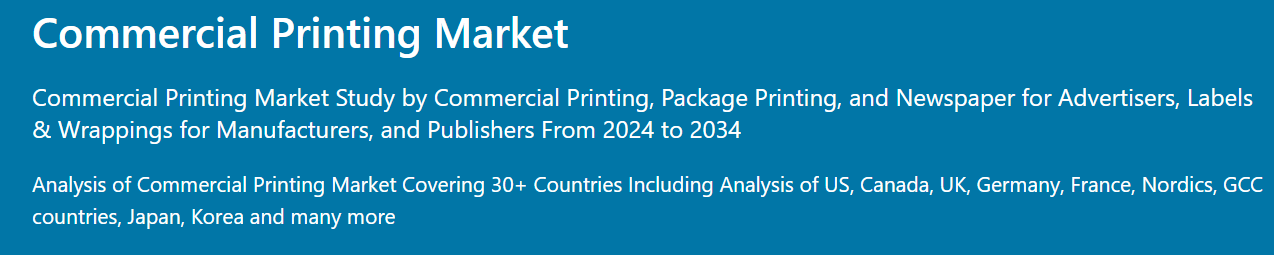 상업용 인쇄에 대한 전 세계 수요는 2024년부터 2034년까지 연평균 3.7%의 성장률을 보일 것으로 예상됩니다.