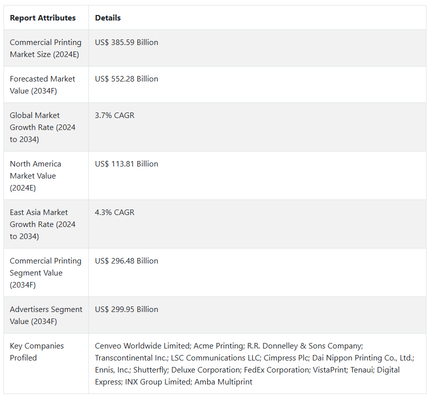Fact.MR이 발표한 새로운 연구에 따르면, 글로벌 상업 인쇄 시장은 2024년에 3,855억 9천만 달러에 달할 것으로 분석되었으며, 2034년 평가 기간 말까지 5,522억 8천만 달러의 가치를 달성하기 위해 연평균 3.7%의 성장률을 보일 것으로 예상됩니다.
