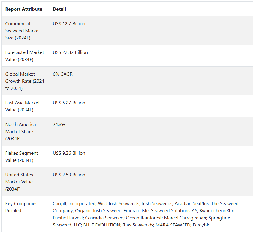 상업용 해조류 시장은 2024년부터 2034년까지 연평균 6%의 성장률을 보일 것으로 예상됩니다.
