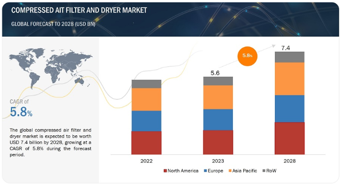글로벌 압축 공기 필터 및 건조기 시장 규모는 2023년 56억 달러로 추정되며 예측 기간 동안 5.8%의 CAGR로 2028년에는 74억 달러에 달할 것으로 예상됩니다. 이러한 성장은 압축 공기 필터 및 건조기 산업의 새로운 트렌드에 기인합니다.