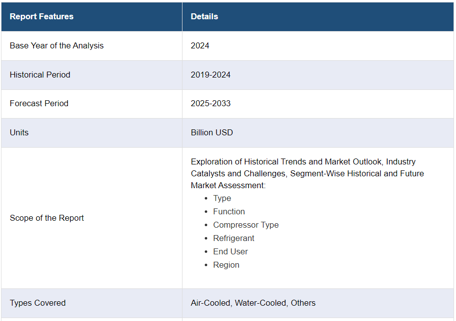 IMARC Group은 2025-2033년 글로벌, 지역 및 국가 수준에서의 예측과 함께 각 시장 부문의 주요 동향에 대한 분석을 제공합니다. 이 보고서는 유형, 기능, 컴프레서 유형, 냉매 및 최종 사용자를 기준으로 시장을 분류했습니다.