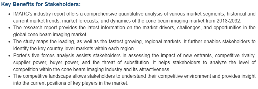 시장 조사 보고서는 또한 시장의 경쟁 환경에 대한 포괄적인 분석을 제공했습니다. 모든 주요 기업의 상세한 프로필도 제공되었습니다. 콘빔 이미징 산업의 주요 시장 플레이어로는 Asahi RoEntgen Ind. Co. Ltd., Carestream Health Inc., Cefla S.C., Curve Beam LLC, Danaher Corporation, Dentsply Sirona, J. Morita Mfg. Corp., Planmeca Group, Prexion Corporation, Vatech Co. Ltd 등이 있습니다.