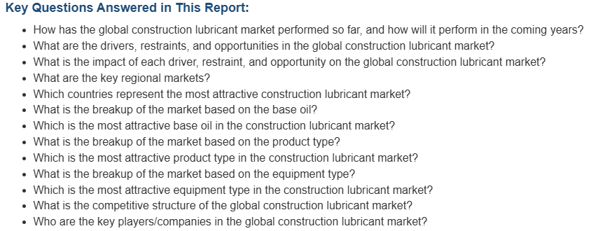 글로벌 시장은 주로 건축 및 건설 산업의 상당한 성장에 의해 주도되고 있습니다. 건설 및 인프라 개발 활동이 상당히 증가함에 따라, 건설 윤활유에 대한 수요도 그에 따라 증가하고 있습니다. 이와 더불어, 운영 비용 절감 및 기계 교체를 촉진하기 위한 장비 유지관리에 대한 인식이 높아짐에 따라 시장이 활성화되고 있습니다. 또한, 장비의 효율성, 내구성, 보호 기능을 향상시키는 고성능 윤활제의 제조 기술의 지속적인 발전이 시장 성장을 촉진하고 있습니다. 뿐만 아니라, 굴착기, 불도저, 크레인 등 중장비의 판매 증가도 시장의 성장을 촉진하는 중요한 요인으로 작용하고 있습니다. 또한, 수많은 최종 사용 산업 분야에서 합성 윤활유의 사용이 증가하면서 시장이 더욱 활성화되고 있습니다. 그러나, 합성 윤활유의 부정적인 영향에 대한 환경 문제가 증가하면서 시장 성장에 걸림돌이 되고 있습니다. 반대로, 주요 업체들이 친환경 관행과 지속 가능한 개발을 빠르게 도입함에 따라 친환경적이고 생분해성 윤활유가 등장하면서 긍정적인 시장 전망이 형성되고 있습니다. 시장에 기여하는 다른 요인으로는 급속한 도시화 및 산업화, 가처분 소득 수준의 증가, 오프라인 및 온라인 소매 채널을 통한 제품의 용이한 이용, 그리고 광범위한 연구개발(R&D) 활동 등이 있습니다.