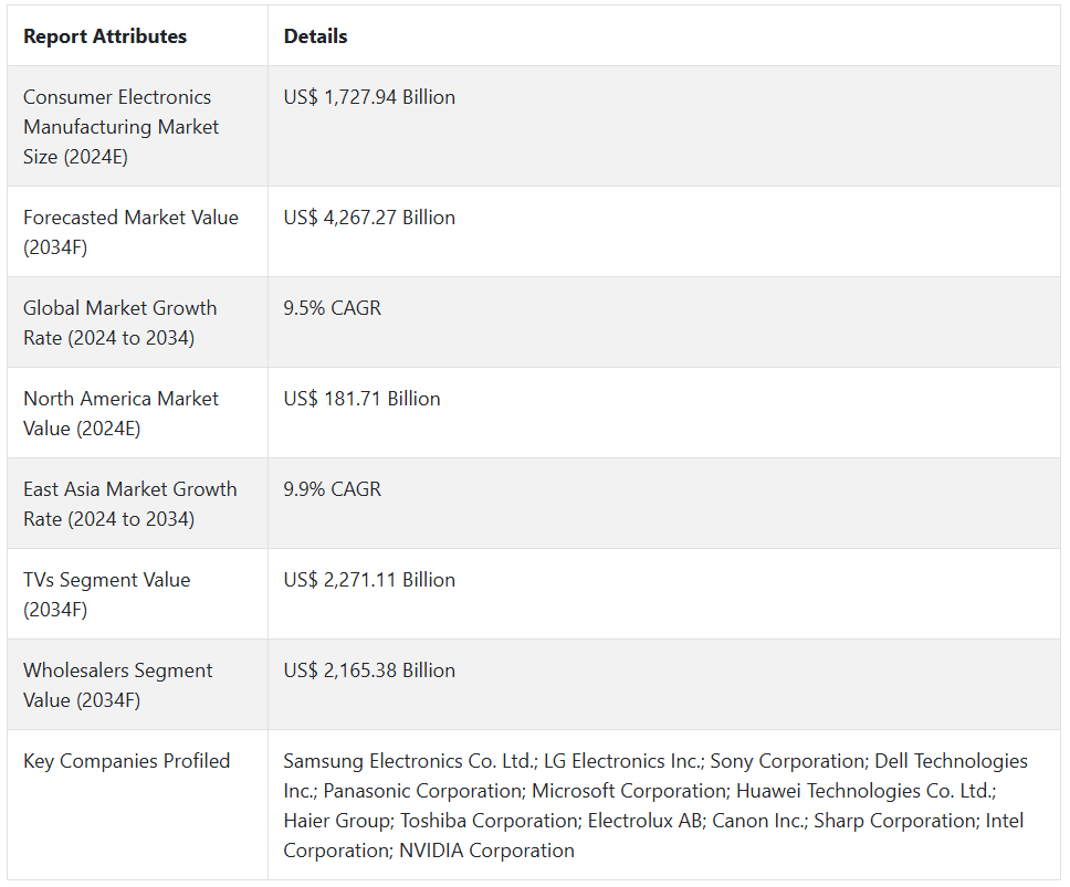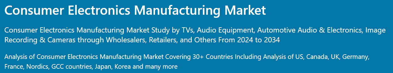 소비자 가전 제조업에 대한 전 세계 수요는 2024년부터 2034년까지 연평균 9.5%의 성장률을 보일 것으로 예상됩니다.