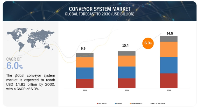 [355페이지 보고서] 글로벌 컨베이어 시스템 시장은 2024년 104억 4천만 달러에서 2030년 148억 1천만 달러로 성장하여 6.0%의 연평균 성장률을 기록할 것으로 전망됩니다. 컨베이어 시스템은 자동화, 모듈식 설계, 센서 기반 운영의 발전에 힘입어 항공, 자동차, 소매 및 유통, 식음료, 광업 등 다양한 산업 분야에서 높은 수요를 보이고 있습니다. 자동화는 인건비와 오류를 줄이면서 컨베이어 시스템의 생산성을 향상시켰습니다. 모듈식 설계는 적응성이 뛰어나 변화하는 산업 요구 사항에 맞게 쉽게 확장하거나 재구성할 수 있습니다. 한편, 센서 기반 프로세스를 통해 실시간 데이터가 전달되어 생산량을 극대화하고 가동 중단 시간을 최소화합니다. 최신 구동 기술과 부품이 진화하면서 컨베이어 시스템의 잠재력과 효율성은 끊임없이 변화하는 현대 산업의 요구 사항을 충족할 수 있도록 향상되고 있습니다.
