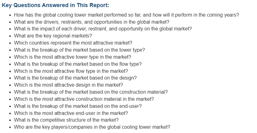 이 연구 시장 보고서는 시장의 경쟁 구도에 대한 포괄적인 분석도 제공합니다. 모든 주요 기업의 상세한 프로필도 제공됩니다. 냉각탑 산업의 주요 시장 참여자 중 일부는 Babcock & Wilcox Enterprises Inc., Baltimore Aircoil Company Inc. (Amsted Industries Inc.), Brentwood Industries Inc., Delta Cooling Towers Inc., ENEXIO Management GmbH, Hamon Corporation (Hamon & Cie), International Cooling Tower Inc., Johnson Controls Inc., SPX Cooling Technologies Inc., Reymsa Cooling Towers Inc., Thermal Care Inc. (IPEG Inc.), and Thermax Limited (RDA Holdings Private Limited) 등이 있습니다.