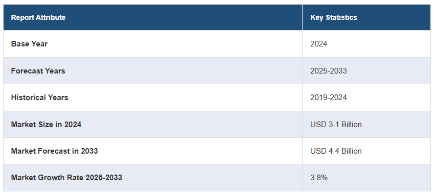 글로벌 냉각탑 시장은 2024년에 31억 달러에 달하며, IMARC 그룹은 2033년까지 44억 달러에 이를 것으로 예상하고 있습니다. 이 시장은 2025-2033년 동안 연평균 성장률(CAGR) 3.8%를 기록할 것으로 보입니다. 에너지 비용 상승과 지속 가능한 조치 채택 증가, 디지털 기술 통합 등으로 인해 시장은 안정적인 성장을 경험하고 있습니다.