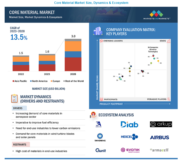 글로벌 핵심 소재 시장은 2023년부터 2028년까지 13.5%의 연평균 성장률을 보일 것으로 예상됩니다. 2023년 핵심 소재 시장 규모는 16억 달러로 추정되며 2028년 말에는 30억 달러에 달할 것으로 예상됩니다. 샌드위치 복합재 시스템에는 강성, 강도, 경량 특성의 특별한 조합을 제공하는 코어 소재가 필요합니다. 핵심 소재는 지속가능성이 점점 더 중요해지면서 항공우주, 풍력 에너지, 해양, 자동차, 건설, 산업 제조와 같은 산업에서 널리 사용되고 있습니다. 이러한 수요 증가는 인프라의 성장, 재생 에너지원의 확대, 기술 향상에 의해 주도되고 있습니다. 기업이 환경에 미치는 영향을 줄이면서 성능과 효율성을 개선할 수 있는 창의적인 방법을 모색함에 따라 핵심 소재는 이러한 변화하는 목표를 달성하는 데 점점 더 중요해지고 있습니다.
