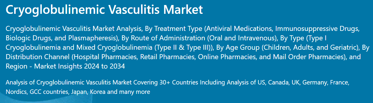 앞서 언급한 사실들을 바탕으로, Cryoglobulinemic Vasculitis 시장은 2024-2034년 예측 기간 동안 연평균 6.9%의 성장률을 보일 것으로 예상됩니다. 시장 조사 및 경쟁 정보 제공 업체인 Fact.MR에 따르면.