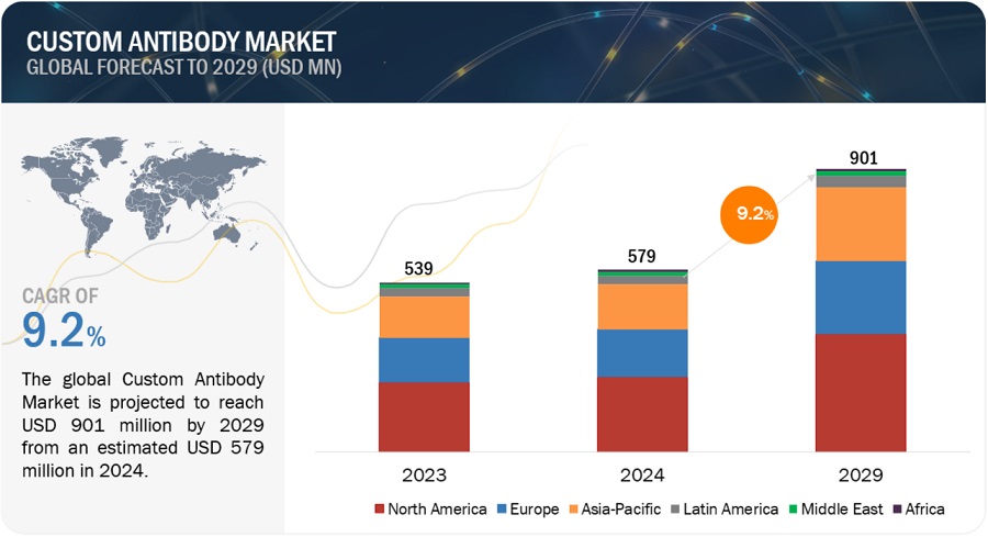 수익 측면에서 글로벌 맞춤형 항체 시장은 2024년에 5억 7,900만 달러의 가치가 있는 것으로 추정되며 2024년부터 2029년까지 9.2%의 CAGR로 성장하여 2029년에는 9억 1,100만 달러에 이를 것으로 전망됩니다. 새로운 연구 조사는 시장의 산업 동향 분석으로 구성됩니다. 새로운 연구 조사는 산업 동향, 가격 분석, 특허 분석, 컨퍼런스 및 웨비나 자료, 주요 이해 관계자 및 시장 내 구매 행동으로 구성됩니다. 이 시장의 성장은 주로 항체 관련 분야의 연구에 대한 정부 자금 및 지원과 중개 의학으로의 확장에 의해 주도되고 있습니다. 맞춤형 항체는 개별 환자의 질병에 고유한 특정 분자 마커를 표적으로 삼도록 설계할 수 있기 때문에 개인 맞춤형 치료에 필수적인 요소입니다. 맞춤형 의료에 대한 관심이 높아지면서 맞춤형 항체 솔루션에 대한 수요도 증가하고 있습니다.