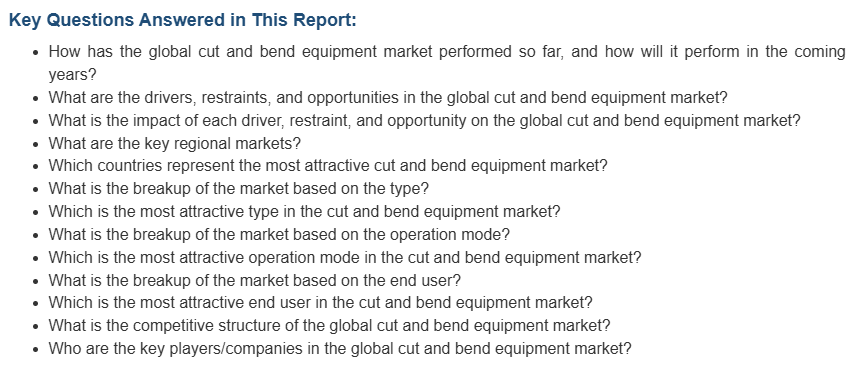 글로벌 시장은 주로 건설 산업의 운영 효율성과 수익성을 개선해야 할 필요성이 증가함에 따라 주도되고 있습니다. 이와 더불어, 환경에 대한 관심이 증가함에 따라 인프라 개발 과정에서 지속 가능성 이니셔티브의 채택이 증가하면서 시장이 주도되고 있습니다. 또한, 건설 프로젝트에서 철근 콘크리트 구조물의 사용이 증가함에 따라 철근을 정확하게 성형하고 배치하기 위한 절단 및 굽힘 기술에 대한 수요가 증가하고 있습니다. 또한, 항공기, 중장비, 자동차 제품 제조에 대한 제품 수요가 증가하면서 수익성 높은 시장 기회가 창출되고 있습니다. 시장에 기여하는 다른 요인으로는 복잡한 건축 설계에 대한 수요 증가, 가처분 소득 수준 상승, 급속한 도시화, 인프라 프로젝트에 대한 공공 및 민간 기관의 투자 증가 등이 있습니다.