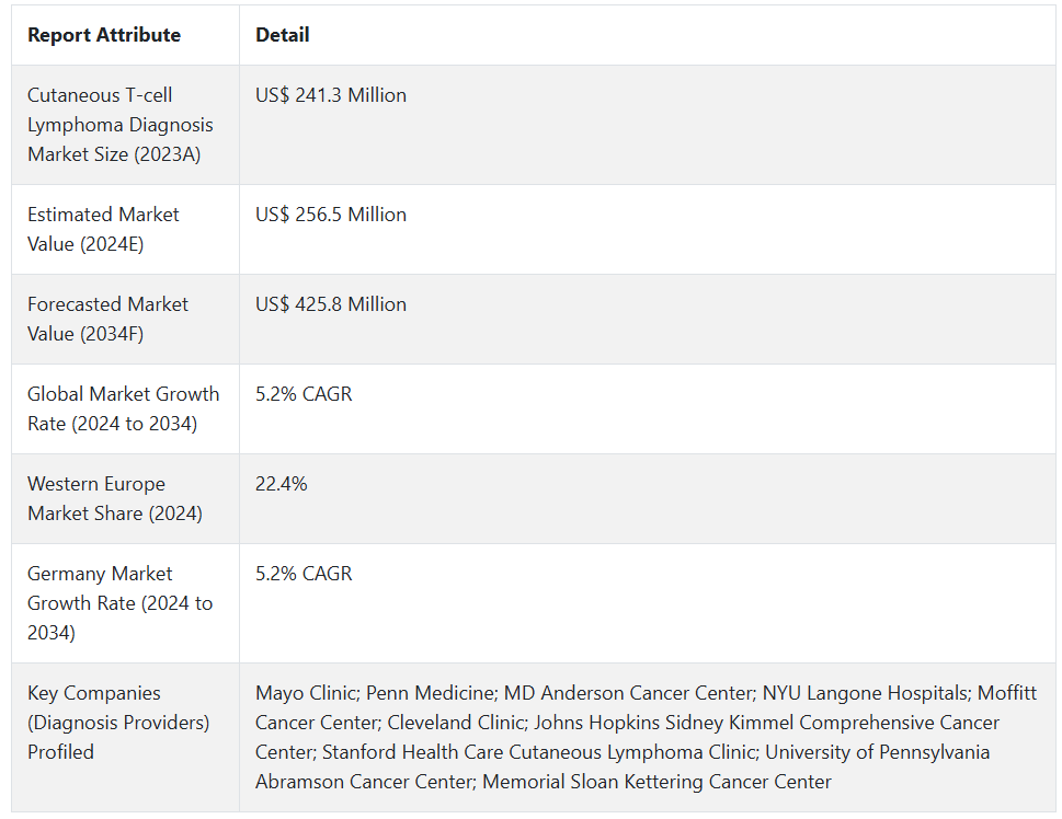 Fact.MR은 최근 발표된 보고서에서 CTCL 진단 분야의 주요 업체, 이 시장의 현재 연구, 최근 주요 발전, 역학 분석, 매출 성장, 기술 확장에 대한 추측 등에 대한 자세한 정보를 제공했습니다.