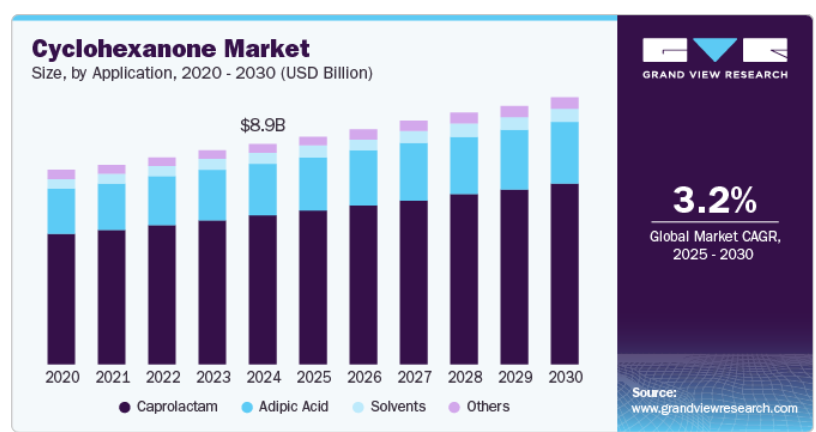 글로벌 사이클로헥사논 시장 규모는 2024년 88억 6천만 달러로 평가되었으며, 2025년부터 2030년까지 연평균 3.2%의 성장률을 보일 것으로 예상됩니다. 이 시장은 주로 자동차, 섬유, 포장 분야에서 점점 더 많이 사용되는 나일론-6과 나일론-6,6을 위한 카프로락탐과 아디프산 생산에 중요한 역할을 하고 있기 때문에 성장하고 있습니다. 자동차 산업에서 연료 효율을 높이기 위해 경량화 및 내구성 강화 소재에 대한 수요가 증가하고, 섬유 산업에서 합성 섬유에 대한 수요가 증가하면서 시장이 확대되고 있습니다. 또한, 사이클로헥사논을 용매 및 화학 및 제약 제조의 중간체로 사용함으로써 적용 범위가 확대되고 있습니다.