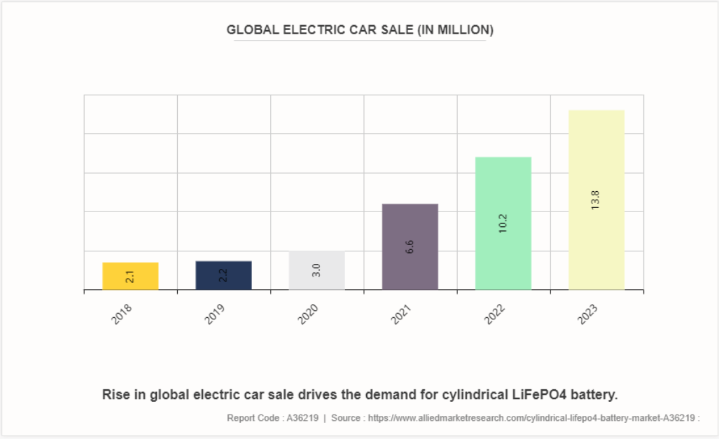 글로벌 전기차 판매의 확대로 인해, 전기차를 구동하는 고성능 배터리에 대한 수요가 증가하고 있습니다. 안전성, 수명, 에너지 밀도가 높은 것으로 알려진 원통형 LiFePO4 배터리는 이러한 증가하는 수요를 충족시킬 수 있는 좋은 위치에 있습니다. 원통형 LiFePO4 배터리 제조업체들은 성장하는 전기차 시장에 공급하기 위해 주문량과 생산량이 증가할 것으로 예상됩니다. 또한, 전기 자동차에 원통형 LiFePO4 배터리의 채택이 증가함에 따라 배터리 제조 인프라와 기술 개발에 상당한 투자가 이루어지고 있습니다. 배터리 제조업체들은 생산 능력을 확대하고 LiFePO4 배터리의 성능과 비용 효율성을 더욱 향상시키기 위해 연구 개발에 투자하고 있습니다. 또한, 전기차 시장의 급속한 확장은 배터리 기술의 혁신과 기술 발전을 촉진합니다. 전기차 제조업체들이 차량의 주행 거리, 성능, 안전성을 향상시키기 위해 노력함에 따라, 전기차 제조업체들은 점점 더 원통형 LiFePO4 배터리를 선호하고 있습니다. 이로 인해 LiFePO4 배터리의 효율성과 에너지 밀도를 향상시키는 데 초점을 맞춘 연구 개발 노력이 이루어졌습니다.