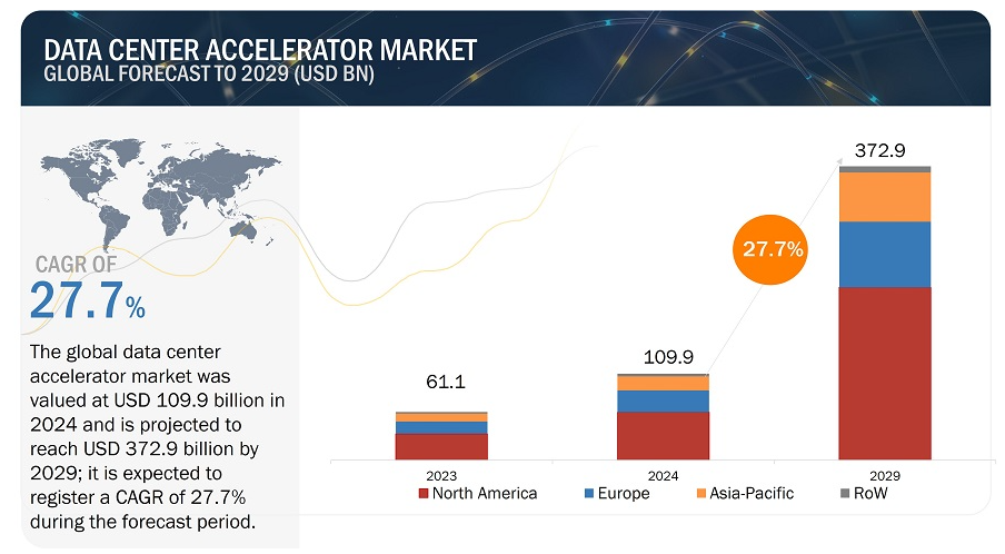 글로벌 데이터 센터 가속기 시장은 2024년 1,099억 달러로 평가되었으며 2029년에는 3,729억 달러에 달할 것으로 예상되며, 예측 기간 동안 27.7%의 연평균 성장률을 기록할 것으로 전망됩니다. 클라우드 기반 서비스에 대한 수요가 증가하고 빅데이터 분석에 딥러닝 기술이 급증하면서 데이터센터 가속기 시스템에 대한 수요가 계속 증가하고 있습니다.