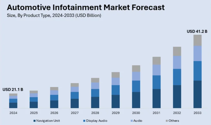 글로벌 자동차 인포테인먼트 시장은 고급 차량용 엔터테인먼트 및 연결 솔루션에 대한 소비자 수요 증가에 힘입어 성장하고 있습니다. 전기 자동차(EV)와 자율 주행 기술의 채택이 증가하면서 내비게이션, 미디어 스트리밍, 실시간 커뮤니케이션을 제공하는 통합 시스템에 대한 필요성이 증폭되고 있습니다. 예를 들어, 국제에너지기구에 따르면 2024년 전 세계 전기차 판매량은 약 1,700만 대에 달할 것으로 예상됩니다. 또한 인공지능, 증강 현실, 음성 인식의 발전으로 사용자 경험과 안전성이 향상되고 있습니다. 또한 스마트폰 보급률 증가와 차량 내 시스템과의 원활한 통합에 대한 수요도 시장 성장을 촉진합니다. 또한 운전자 안전에 대한 규제와 특히 전기 자동차 부문에서 에너지 효율적인 시스템에 대한 선호도가 높아지는 것도 시장 확대에 중요한 역할을 합니다.