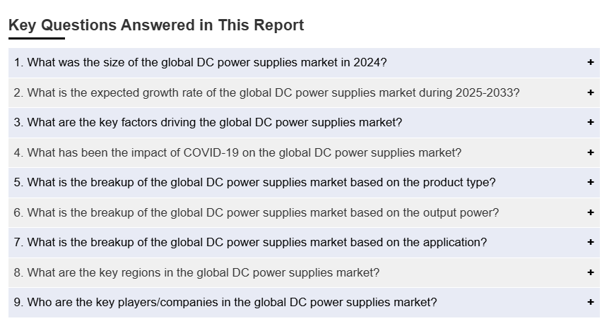 IMARC 그룹은 2025-2033년 기간 동안의 글로벌, 지역, 국가 수준의 예측과 함께, 글로벌 직류 전원 공급 장치 시장 보고서의 각 하위 부문에서 주요 트렌드에 대한 분석을 제공합니다. 저희의 보고서는 제품 유형, 출력 전력, 응용 프로그램에 따라 시장을 분류했습니다.