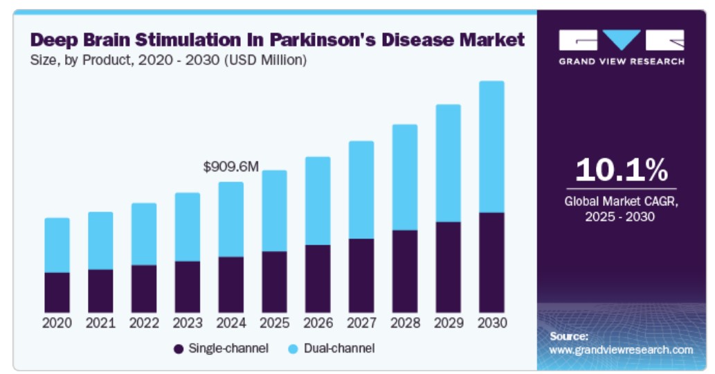 파킨슨병의 전 세계 뇌심부자극술 시장 규모는 2024년에 9억 9,960만 달러로 평가되었으며 2025년부터 2030년까지 10.1%의 연평균 성장률을 보일 것으로 예상됩니다. 이러한 성장은 파킨슨병 및 기타 신경계 질환의 유병률 증가로 인해 심부 뇌 자극(DBS)과 같은 고급 치료 옵션이 필요하기 때문입니다. 또한 파킨슨병에 더 취약한 노인 인구의 증가도 시장 성장에 크게 기여하고 있습니다. 미세 전극 설계 개선, 로봇 보조 이식 등 DBS 장치의 기술 발전으로 치료의 효과와 안전성이 향상되고 있습니다.
