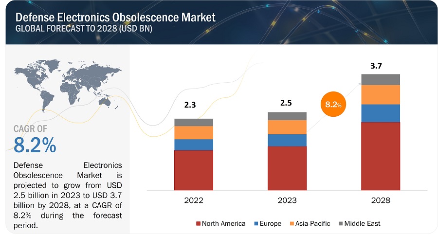 방위 전자제품 노후화 시장은 2023년 25억 달러에서 2028년 37억 달러로 예측 기간 동안 8.2%의 연평균 성장률로 성장할 것으로 예상됩니다. 방위 전자제품 노후화의 시장 역학은 급속한 기술 발전, 엄격한 규제 요건, 노후화된 시스템을 유지, 업그레이드 및 최신 시스템으로 교체해야 하는 끊임없는 필요성을 특징으로 하는 독특하고 진화하는 환경을 제시합니다. 이 분야는 국가 안보와 국방 역량을 유지하는 데 매우 중요하지만, 기술 변화의 빠른 속도, 예산 제약, 방위 전자제품의 특수성 등 수많은 도전 과제에 직면해 있습니다.